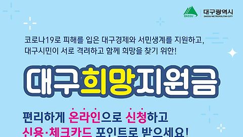 대구광역시에서는 코로나19로 피해를 겪고 있는 대구경제와 서민 생계를 지원하기 위한 2차 긴급 생계자금을 대구희망 지원금으로 지급하기로 결정하였습니다. 이번 2차 지급대상은 소득과 직업에 따라 선별적으로 지원한 1차 생계자금 지급 때와 다르게 대구광역시에 주민등록된 모든 시민이 대상입니다. (2020년7월30일 24시 기준 주민등록표에 등재된 내국인, 외국인이 모두 포함됩니다. 주민등록표 미등재자는 제외 됩니다. 김태일 대구시 코로나19 서민생계지원위원장은 20일 오전 11시 대구시청 본관 2층 상황실에서 기자회견을 열어 계획을 발표하였습니다. 2차 긴급 생계자금은 https://대구희망지원금.kr에서 대상자 조회및 사용안내를 받을 수 있습니다. 조회기간:2020.8.24(월) 09:00 ~ 09.25(..